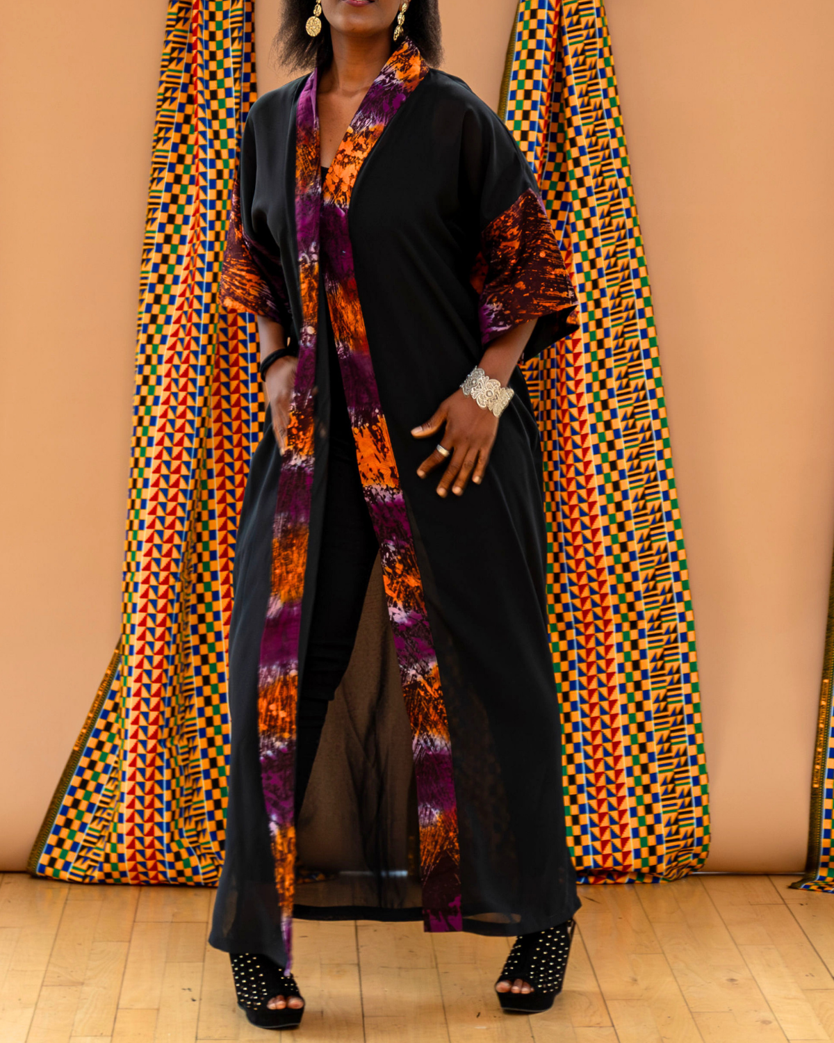 The standout feature is the intricate batik-inspired trim in rich shades of orange, purple, and earth tones, which adds a bold pop of color and artistic texture to the sleeves and front opening. Whether you’re layering it over a sleek jumpsuit for an evening event or pairing it with simple denim for a daytime look, this kimono offers a perfect blend of elegance and effortless style.