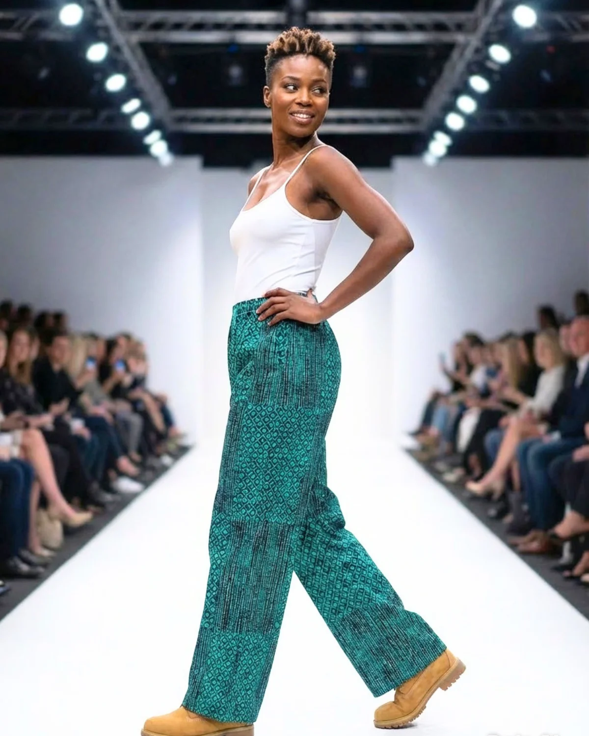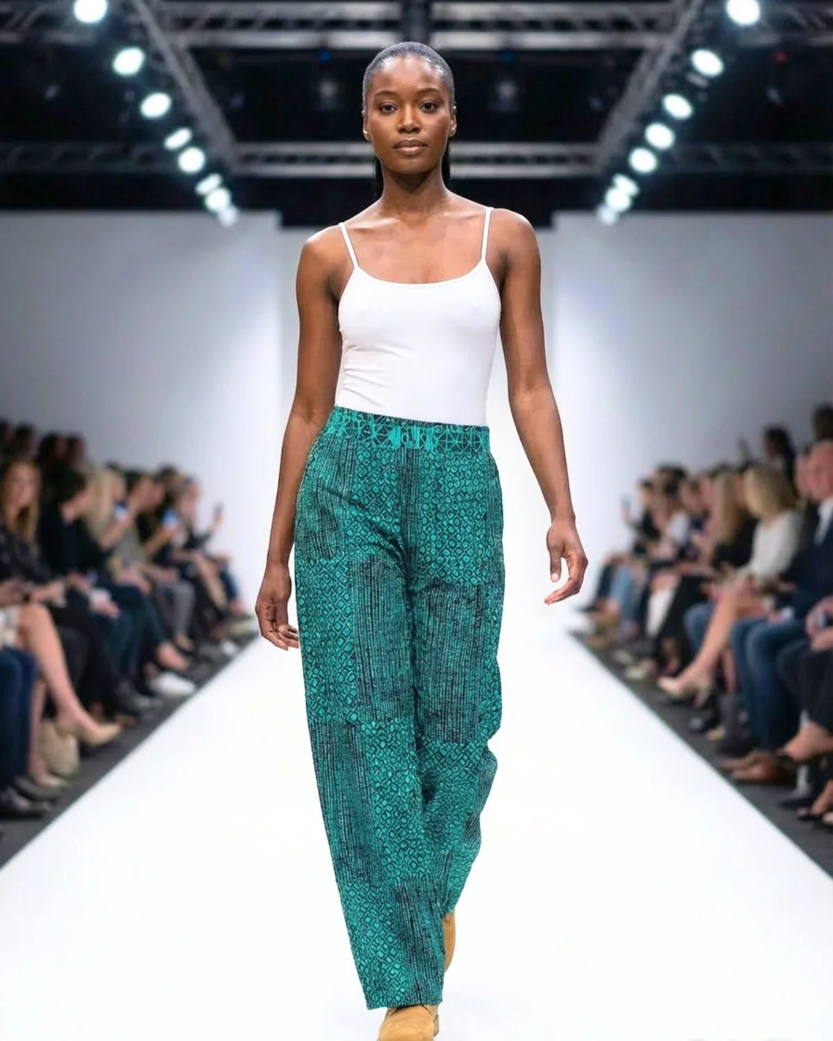 Emerald Geometric Print Trousers. Expertly designed to combine structured elegance with maximum comfort, these trousers feature an intricate, multi-tonal geometric pattern in shades of teal, forest green, and black.