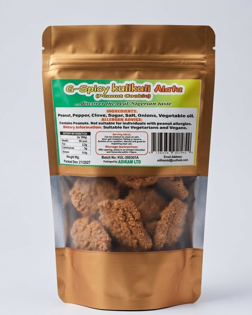 Experience the bold, crunchy, and fiery taste of West Africa with G-Spicy Kulikuli Alata. These traditional Nigerian peanut cookies are expertly crafted using roasted peanuts and a signature blend of spicy peppers and aromatic cloves. Perfectly crispy and packed with protein, they offer a savory heat that makes them an irresistible snack for any time of day.