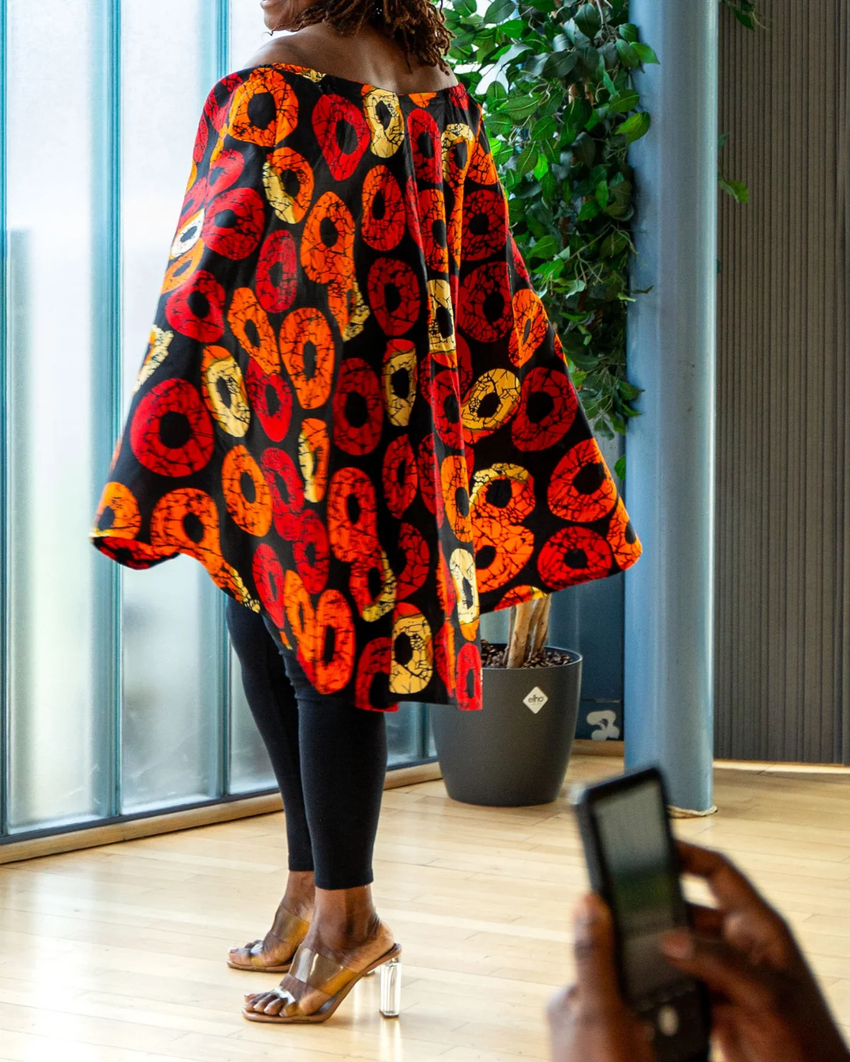 Make a bold fashion statement with this stunning Ankara African Print Free-Size Cape Top. Infused with the rich heritage of African textiles, this cape features a striking concentric circle pattern in fiery shades of red, orange, and golden yellow set against a deep black background.