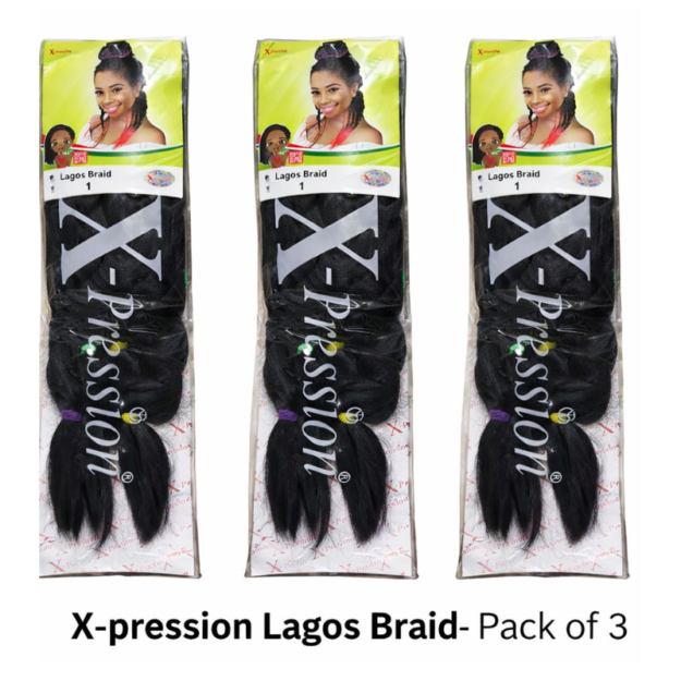 X-Pression Lagos Braid. This pack features Color 1 (Jet Black), providing a deep, rich hue that offers timeless elegance. The hair is crafted from high-quality synthetic fibers that are heat-resistant and exceptionally durable, ensuring your protective style stays fresh for weeks.